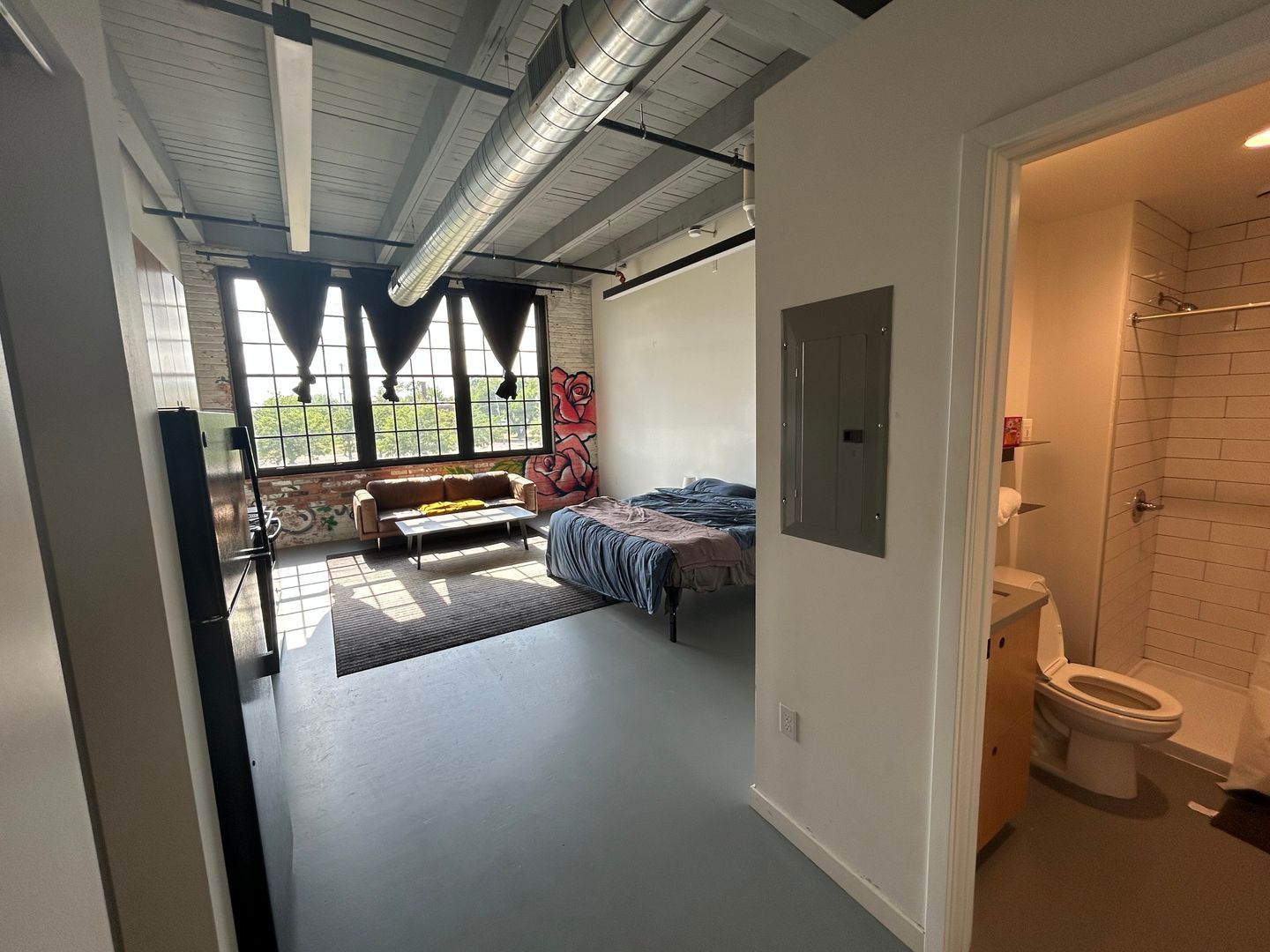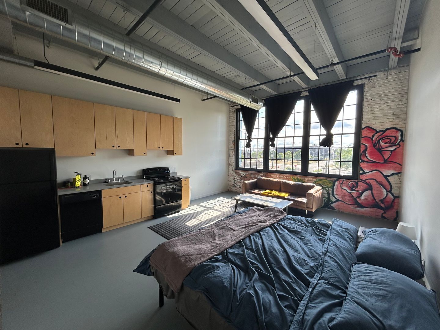 Studio units are the most common space available at Dreamtroit. Raw and industrial but with comfortable and efficient kitchen and bath, these micro loft style units come in a multitude of sizes. Useable for living space, small business, or artist/musician studio.