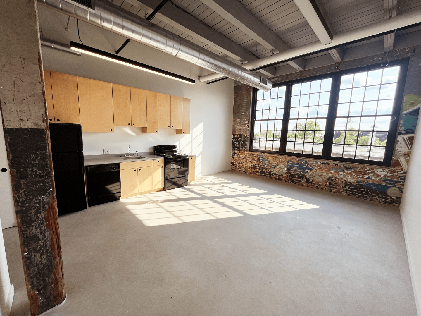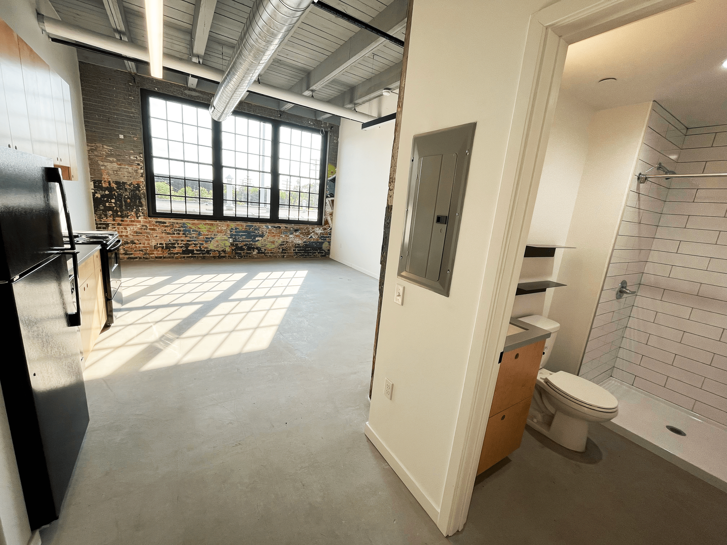 Studio units are the most common space available at Dreamtroit. Raw and industrial but with comfortable and efficient kitchen and bath, these micro loft style units come in a multitude of sizes. Useable for living space, small business, or artist/musician studio.