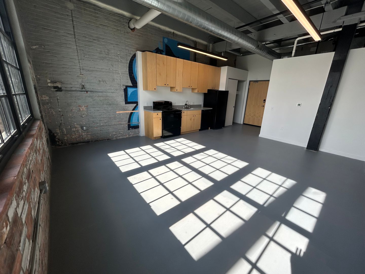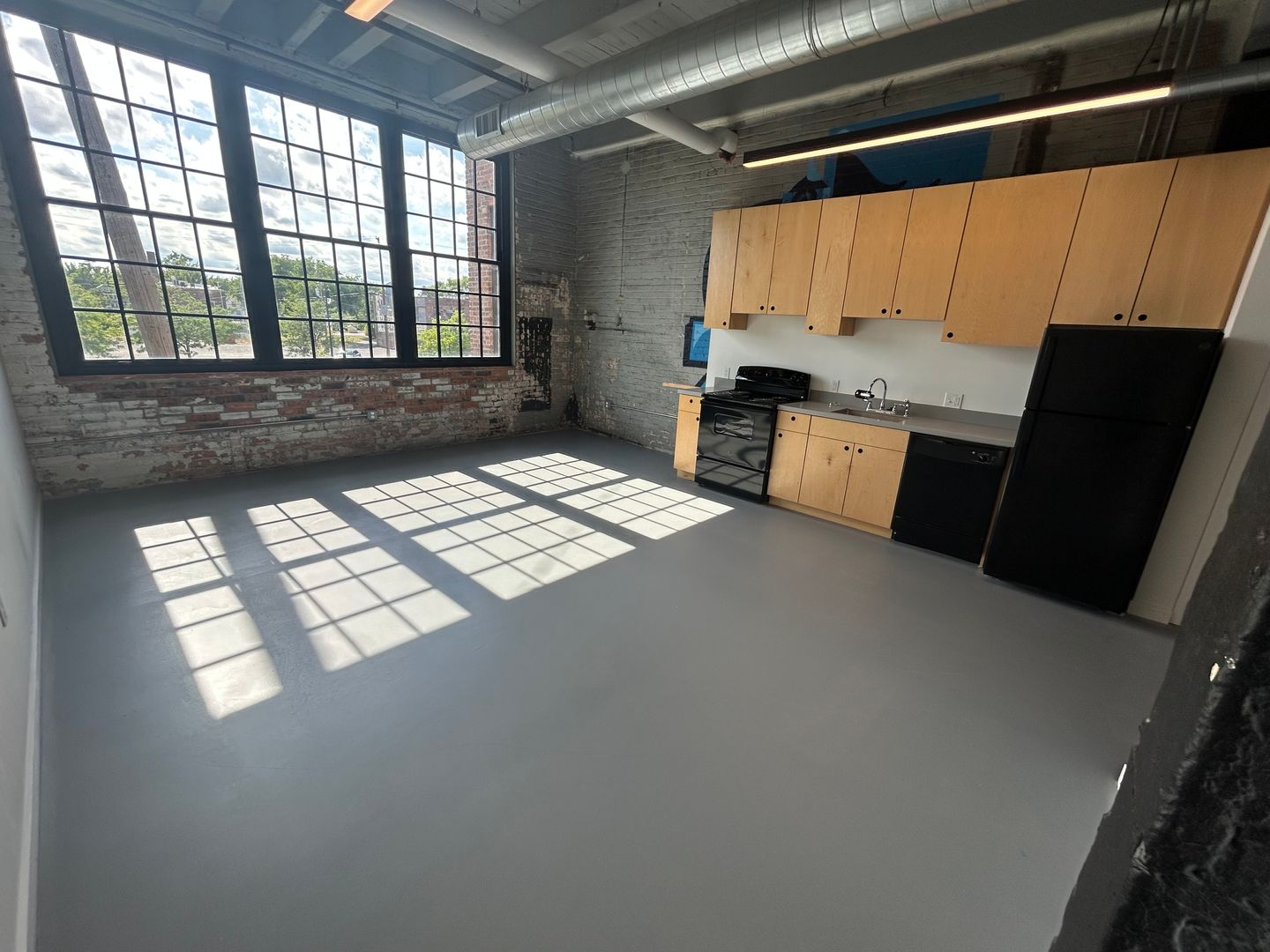Studio units are the most common space available at Dreamtroit. Raw and industrial but with comfortable and efficient kitchen and bath, these micro loft style units come in a multitude of sizes. Useable for living space, small business, or artist/musician studio.