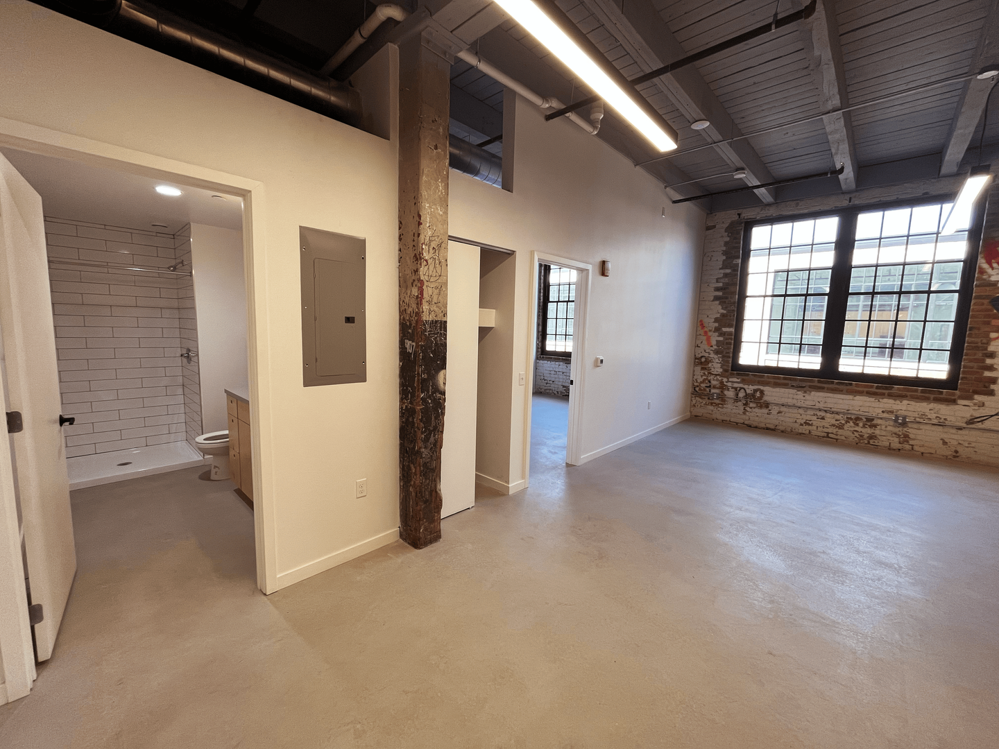 1 Bedroom units allow the convenience of a larger square footage and a separate room in this micro loft style space. An efficiency kitchen and bathroom, along with original urban artwork on the exposed brick, adds function to artistic vibes.